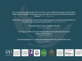 On the leafy banks of the River Ness, Ness Walk is home to 5* Luxury. The gated entrance announces your arrival and from the glass of champagne on arrival to the 47 exquisite bedrooms, prepare to be cosseted in our warm Highland welcome.